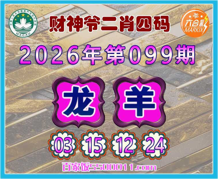 099期:【财神爷】 👛二肖四码👛【龙】【03.15.12.24】开:羊12